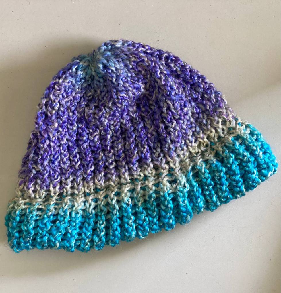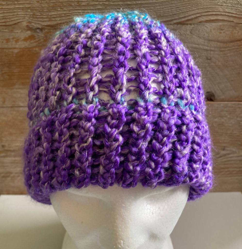 Colourful, warm beanie for kids and adults. Purple and blue. Acrylic yarn.