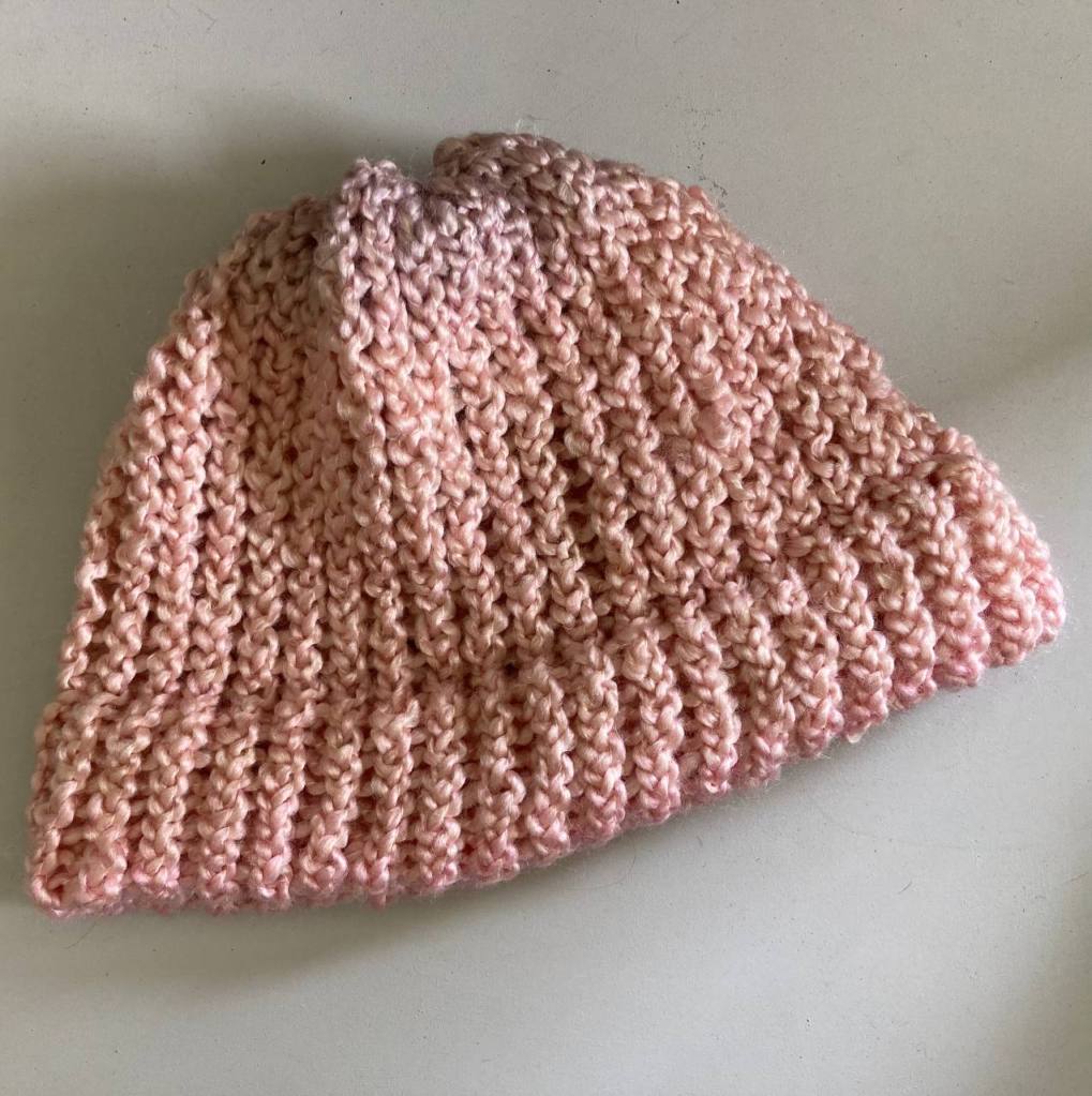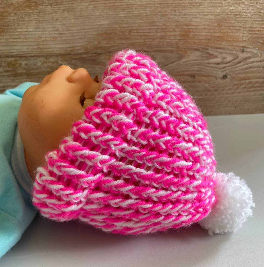 Colourful and functional present for a small baby. White and pink, with a white pompom. Acrylic yarn to avoid an itchy baby scalp.