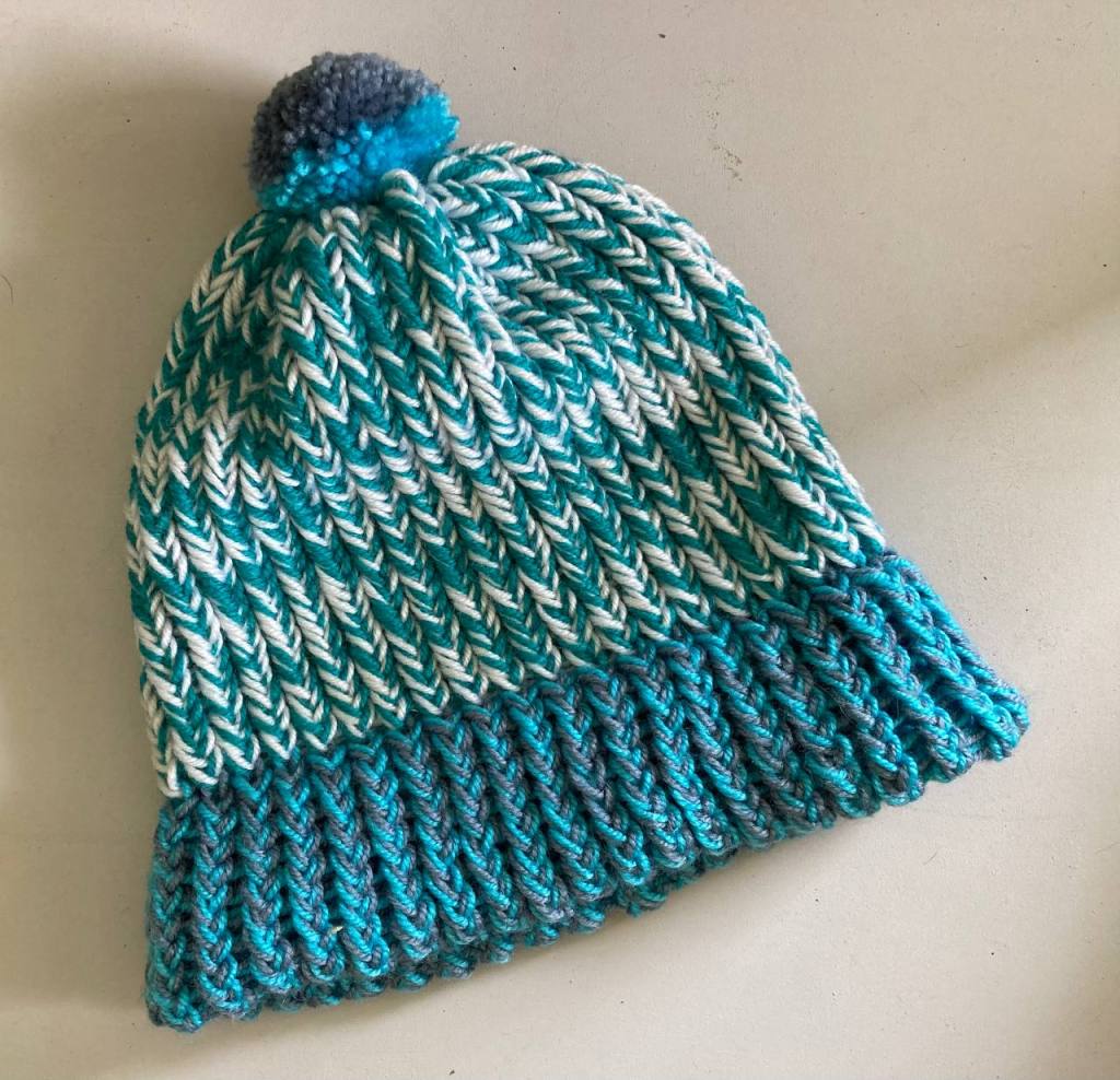 Colourful, warm beanie for adults. Blue and grey, turquoise and white. With pompom. Acrylic yarn.