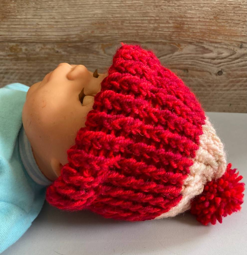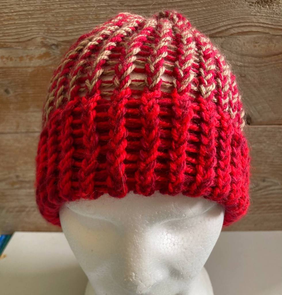 Colourful, warm beanie for kids and adults. Red and beige. Acrylic yarn.