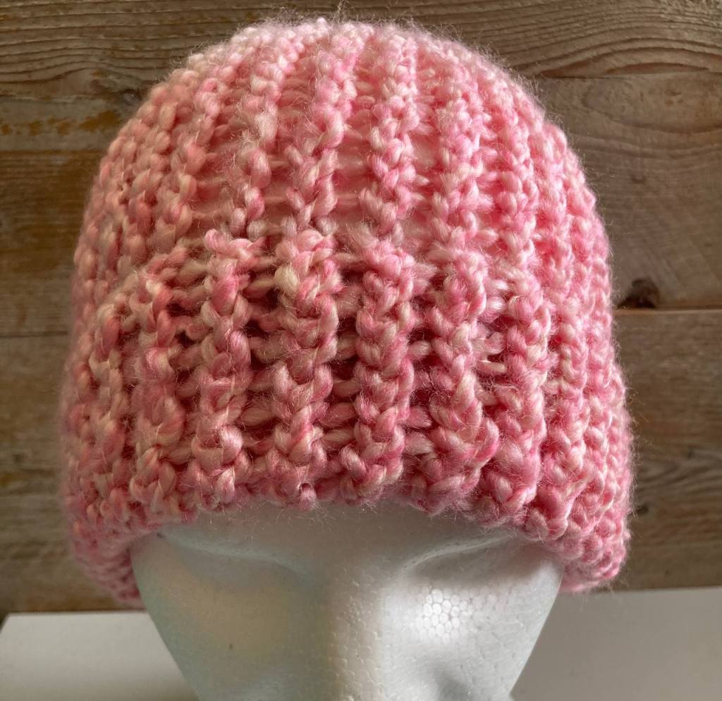 Colourful, warm beanie for kids and adults. Pink and cream. Acrylic yarn.