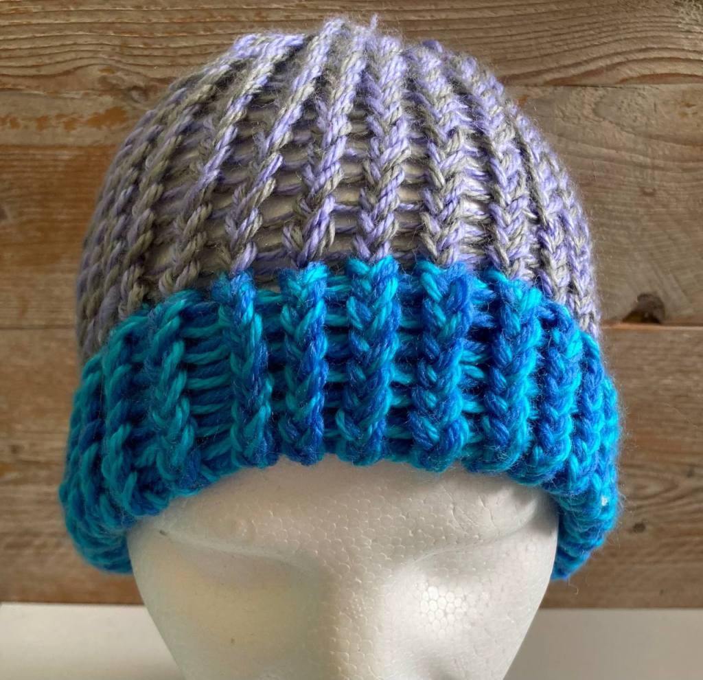Colourful, warm beanie for kids and adults. Silver, lilac, blue and two tones of blue. Acrylic yarn.