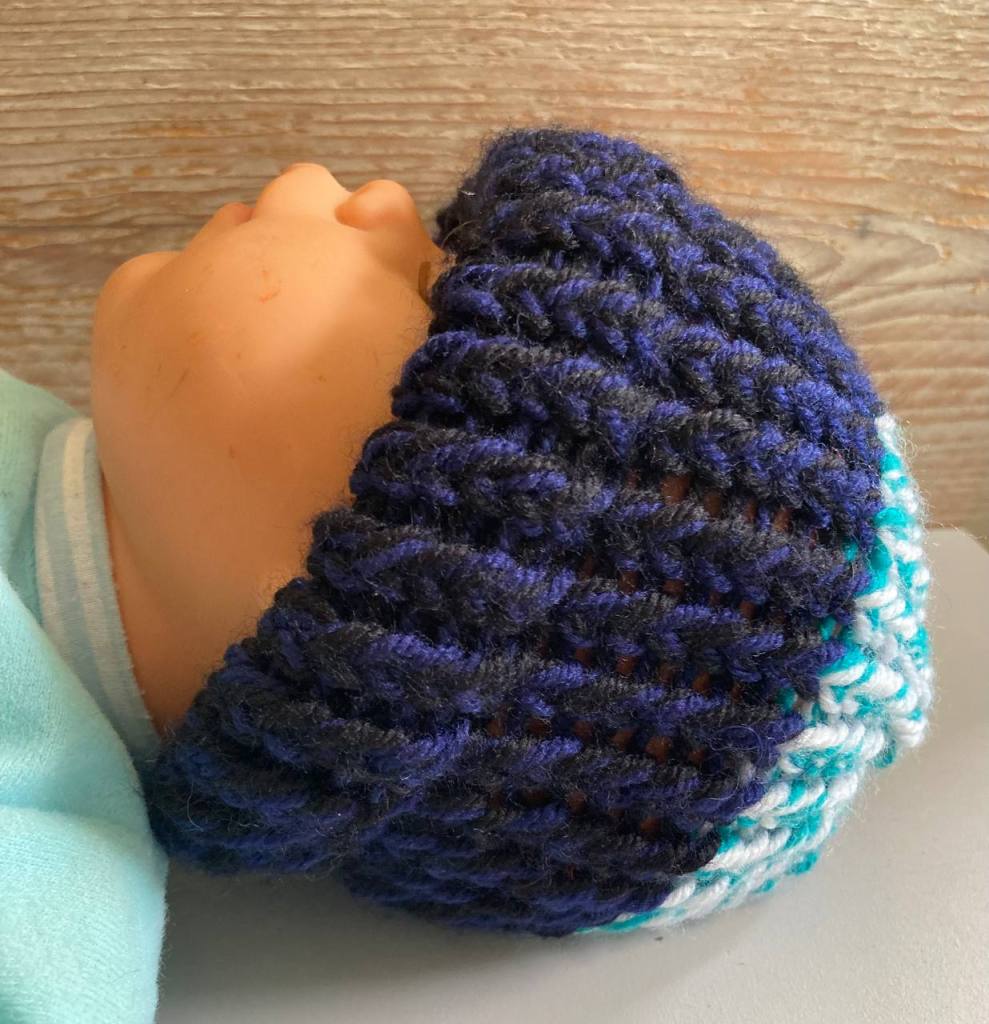 Colourful and functional present for a small baby. Black, navy, turquoise and white. Acrylic yarn to avoid an itchy baby scalp.