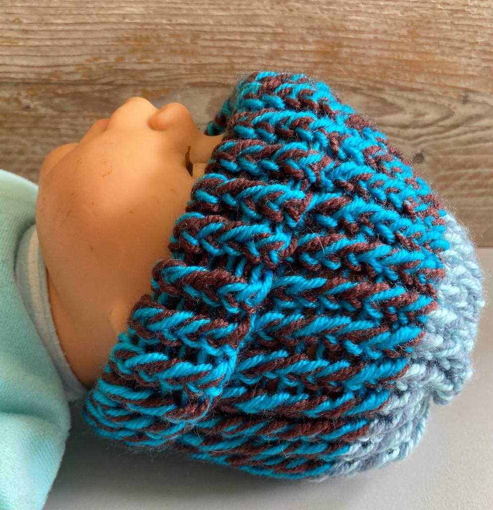 Colourful and functional present for a small baby. Brown and three types of blue. Acrylic yarn to avoid an itchy baby scalp.