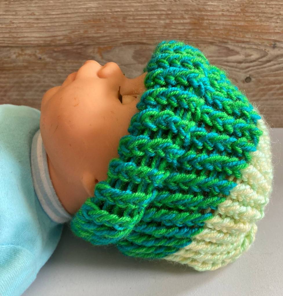 Colourful and functional present for a small baby. Yellow and three types of green. Acrylic yarn to avoid an itchy baby scalp.