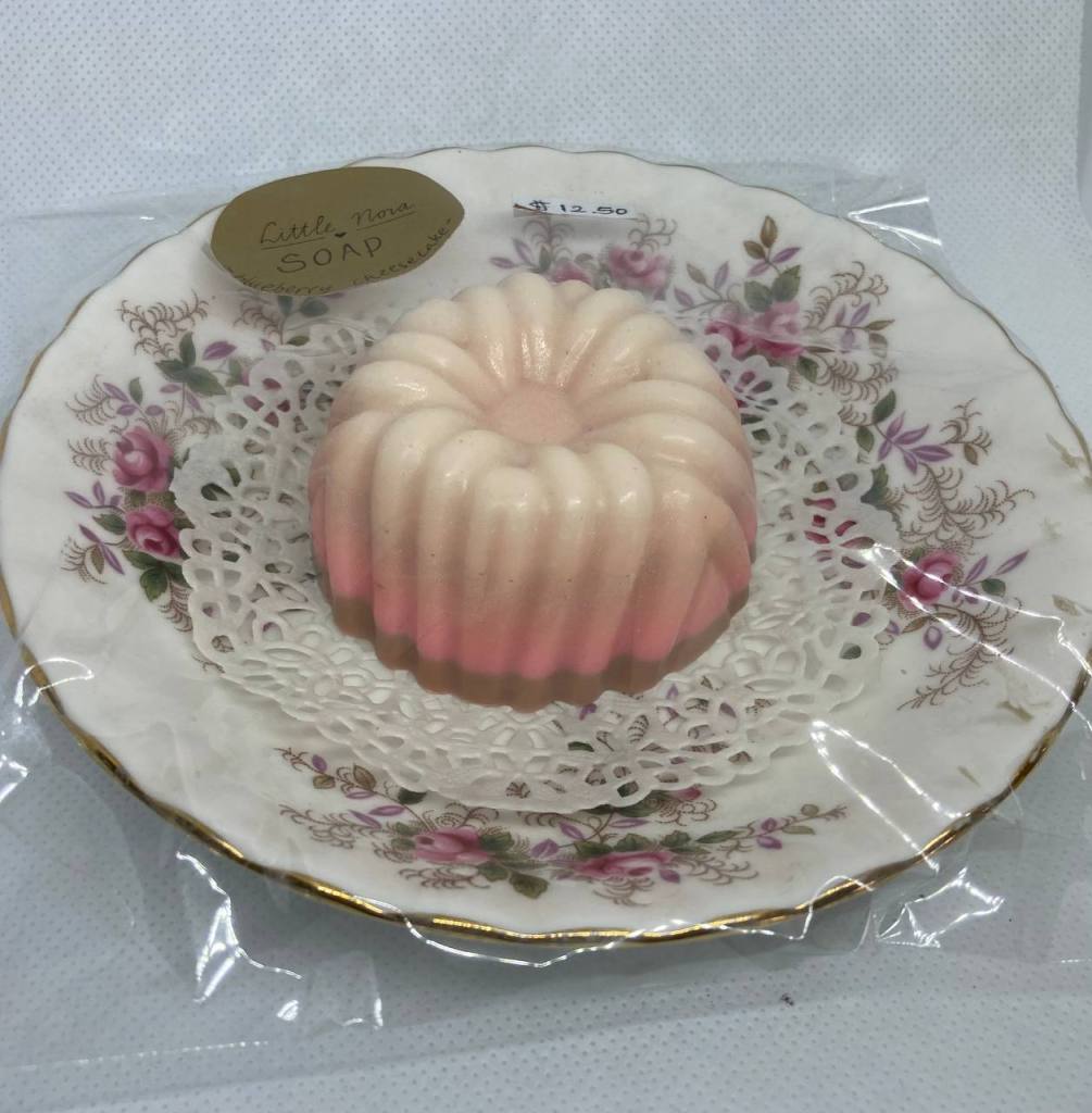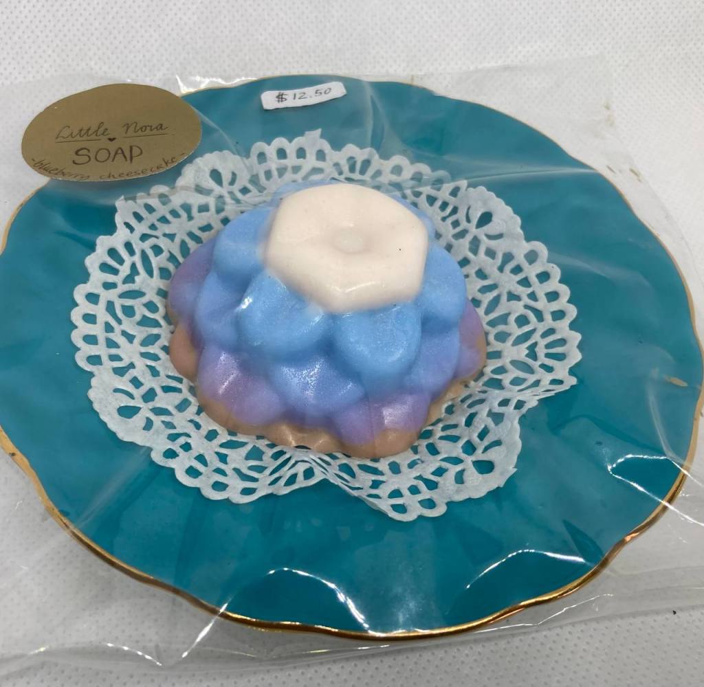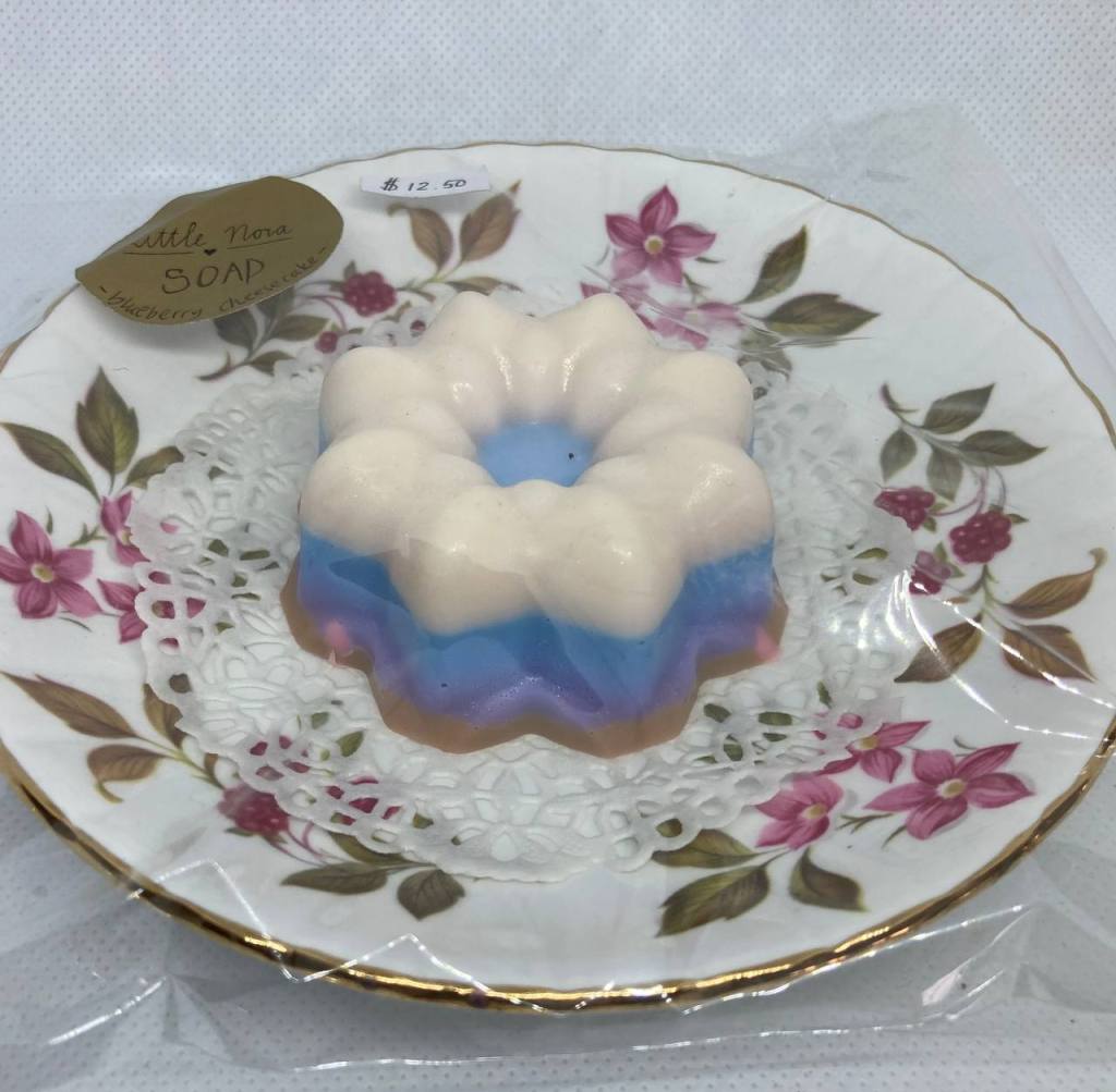 Cake shaped soap on a pretty saucer with blueberry cheesecake scent.