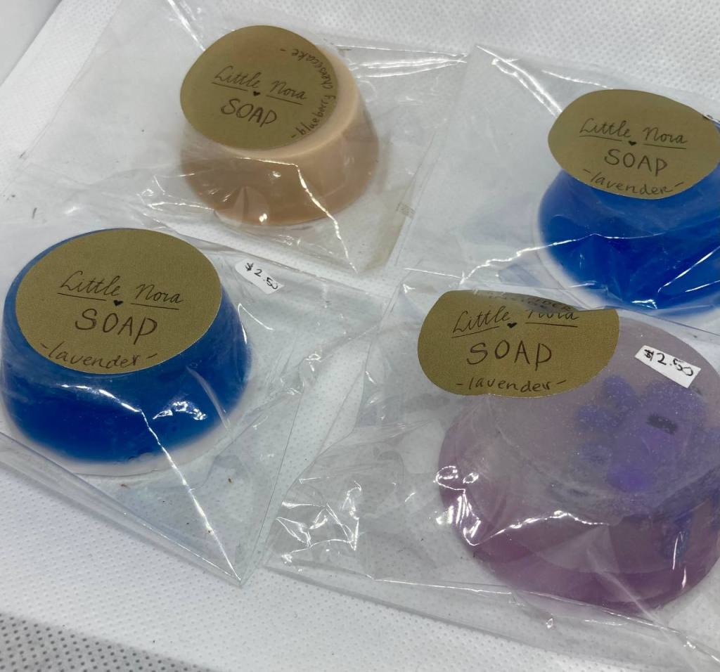 Round shaped soap. Several different scents. Only available at the markets and the pop up shop.
