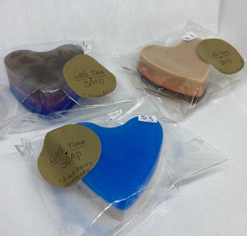 Heartshaped soap with lavender or blueberry cheesecake scent. Only available at the markets and the pop up shop.