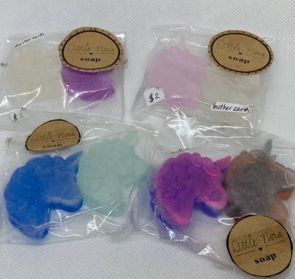 Cute smaller unicorn soaps, 2 in a package. Random scents (lavender, rose etc.). Only available at the markets and the pop up shop.